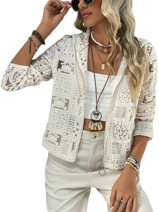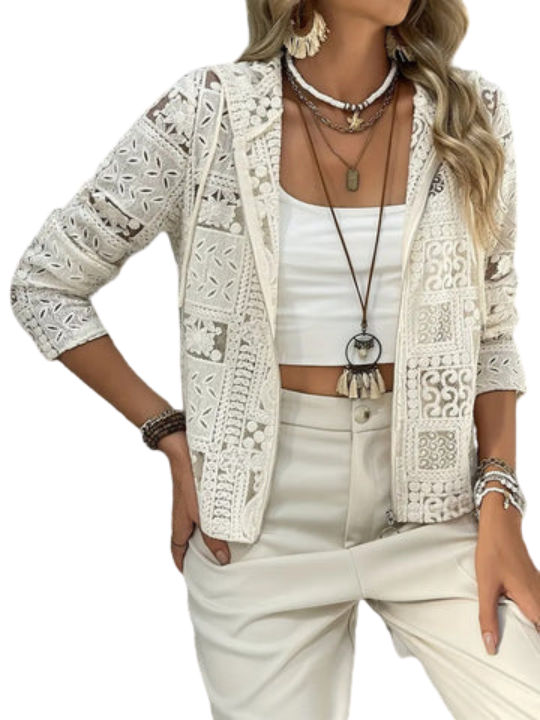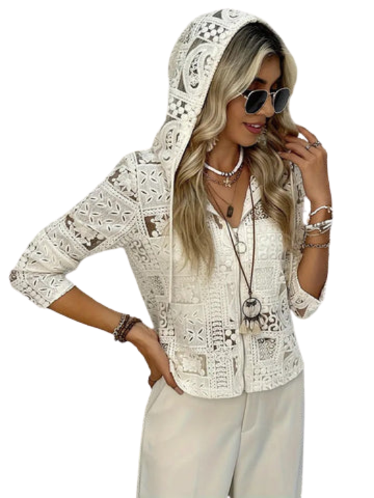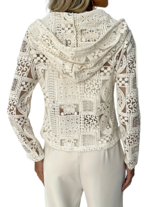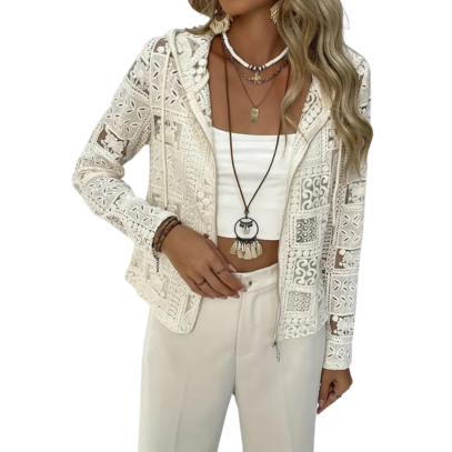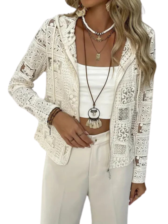 מעיל אלגנטי בצבע בז' עם כובע משלב אלגנטיות ונוחות בעיצוב אופנתי. דגם מורכב של עיניים ופרטי תחרה נותנים למעיל מראה מעודן, והזיפ ושרוולים ארוכים הופכים אותו לפרקטי וקל ללבישה לאורך כל השנה.